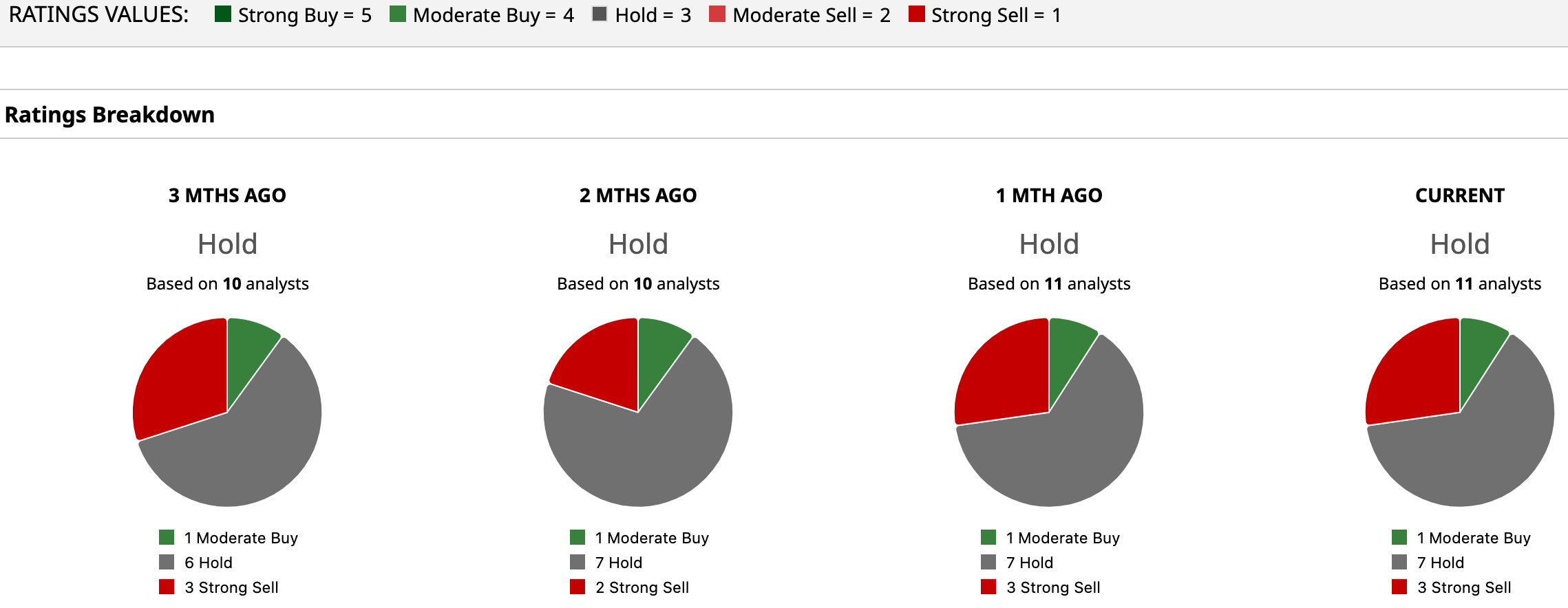 Wall Street analysts recommend caution at the moment, giving a consensus “Hold” rating overall. Of the 11 analysts rating the stock, one analyst has a “Moderate Buy” rating, seven analysts take a middle-of-the-road approach with a “Hold,” and the remaining three have a “Strong Sell” rating.