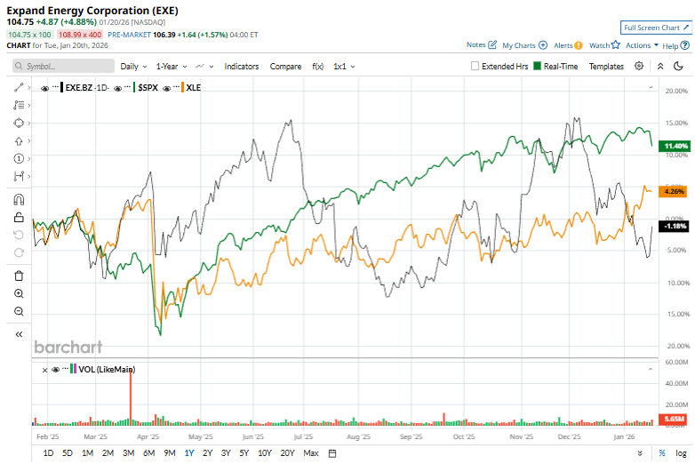 Expand Energy shares rose more than 4% on Jan. 20, outperforming peers as U.S. natural gas prices surged over 26% to a three-week high, driving broad strength across natural gas–focused producers.