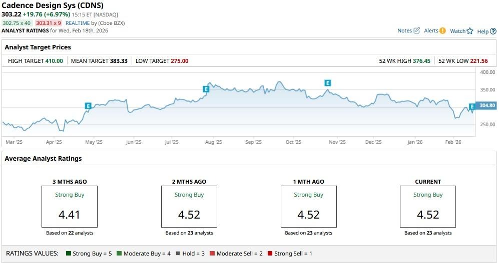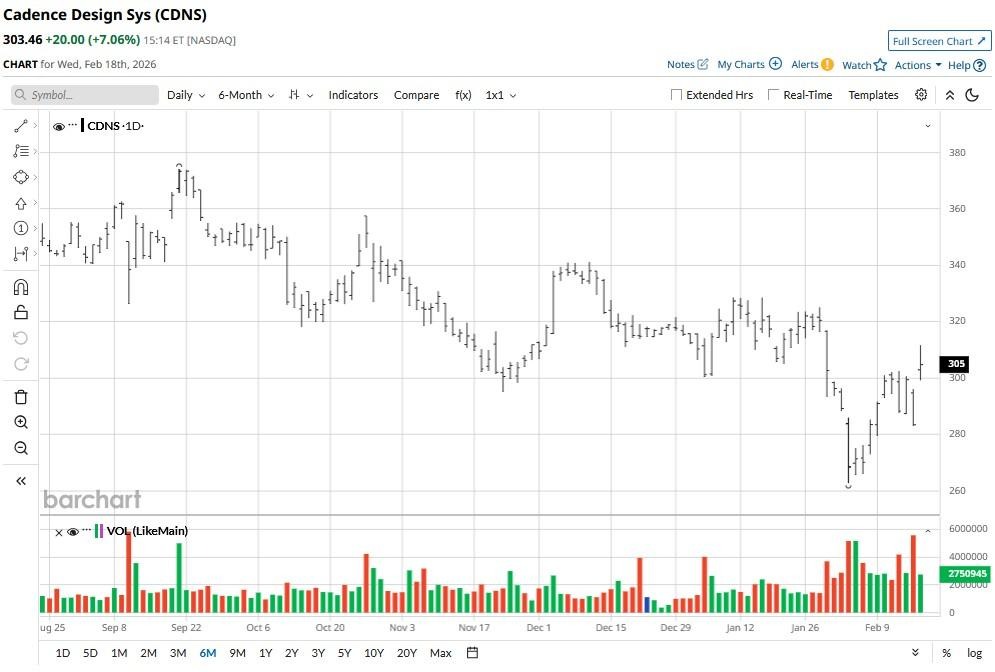 Cadence Design Systems (CDNS) stock pushed meaningfully higher on Feb. 18, after the electronic design automation (EDA) software giant silenced artificial intelligence (AI) disruption fears with a strong Q4 release. As investors cheered its better-than-expected 2026 earnings guidance, the company’s share price exploded up to challenge its 50-day moving average (MA) at the $311 level.