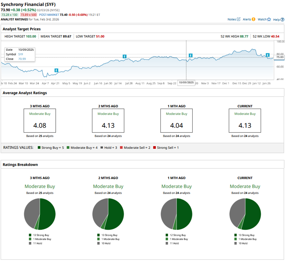 SYF stock has a consensus “Moderate Buy” rating overall. Of the 24 analysts covering the stock, opinions include 13 “Strong Buys,” one “Moderate Buy,” and 10 “Holds.”