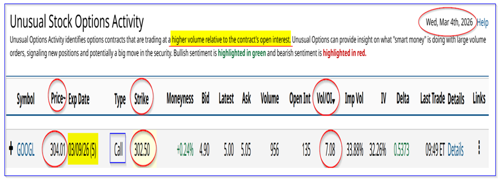 This can be seen in today's Barchart Unusual Stock Options Activity Report. It shows that almost 1,000 call option contracts have traded at the $302.50 strike price for expiry on March 9, 2026 (Monday).