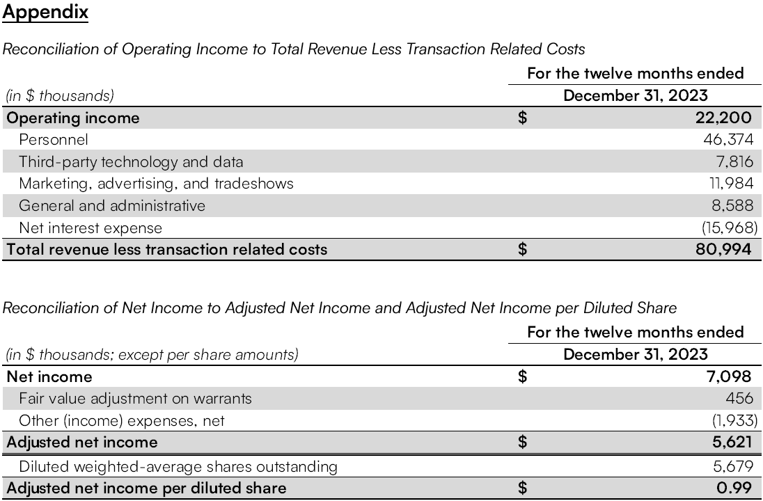 • Total revenue less transaction-related costs is not intended to be measures of operating profit or cash flow profitability as they exclude key operating expenses such as personnel, general and administrative, and third-party technology and data, which have been, and will continue to be for the foreseeable future, significant recurring GAAP expenses.