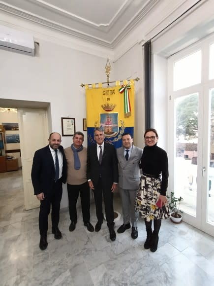 Juve Stabia Administrator Filippo Polcino, Mayor Luigi Vicinanza, Brera Holdings Executive Chairman Daniel McClory, Juve Stabia President Andrea Langella, and Sports Councilor Nunzia Acanfora in Castellammare di Stabia