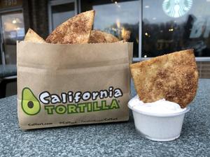 Love chips are flour tortilla chips sprinkled with cinnamon sugar and they are served with delicious blend of sour cream and cinnamon sugar. California Tortilla serves up its award-winning signature burritos, quesadillas, and salads at more than 30 locations across the East Coast in Maryland, Virginia, West Virginia, Pennsylvania, Delaware, Massachusetts, New Jersey, and the District of Columbia.