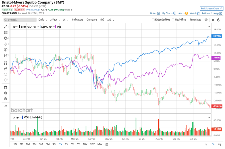 Narrowing the focus, BMY’s underperformance is also apparent compared to the iShares U.S. Pharmaceuticals ETF (IHE). The exchange-traded fund has gained 5.2% over the past year. Moreover, the ETF’s 12.5% returns on a YTD basis outshine the stock’s losses over the same time frame.