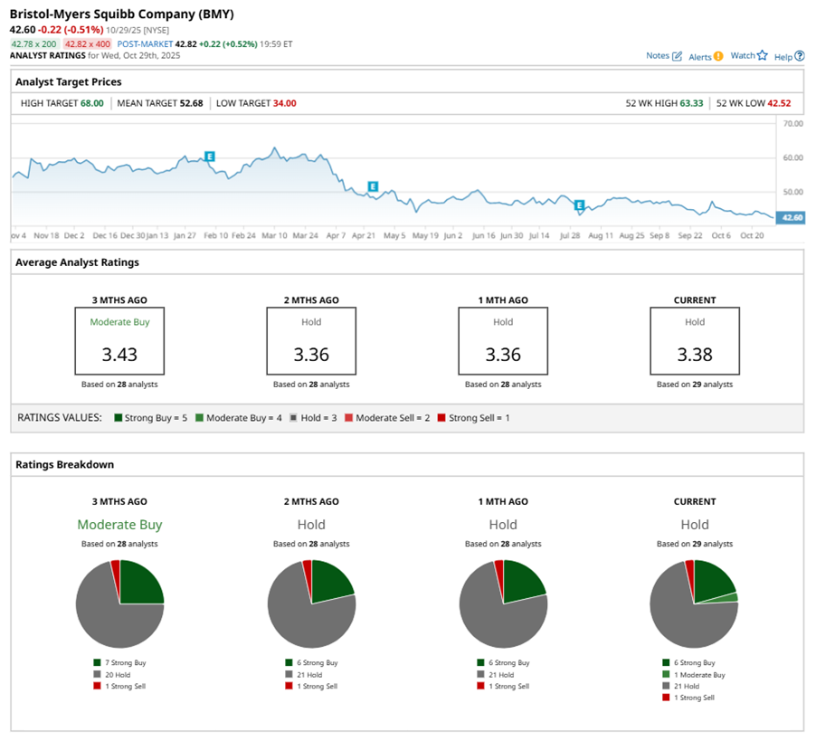 Among the 29 analysts covering BMY stock, the consensus is a “Hold.” That’s based on six “Strong Buy” ratings, one “Moderate Buy,” 21 “Holds,” and one “Strong Sell.”
