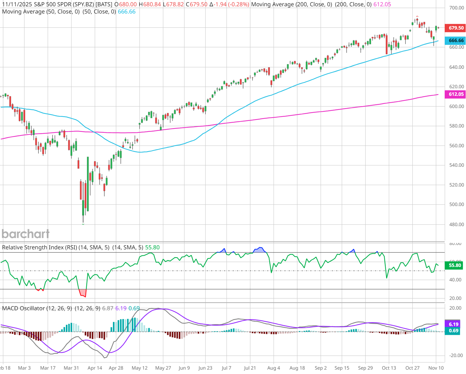 When the price trades above it, the market is typically healthy and trending higher. When price falls below the moving average, it can signal weakness — or even the start of a larger correction.