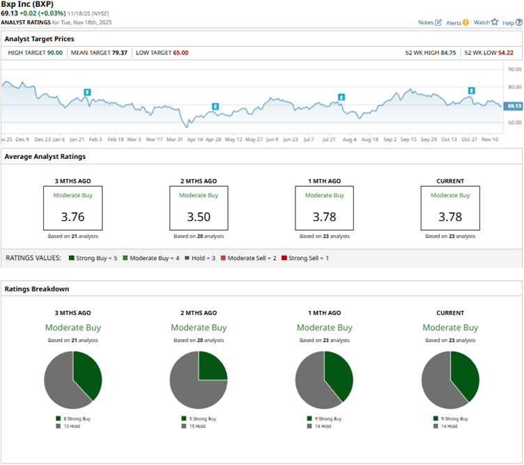 Among the 23 Wall Street analysts covering BXP’s stock, the consensus is a “Moderate Buy.” That’s based on nine “Strong Buy” ratings and 14 “Holds.” The ratings configuration is more bullish than it was two months ago, with nine “Strong Buy” ratings now, up from five previously.