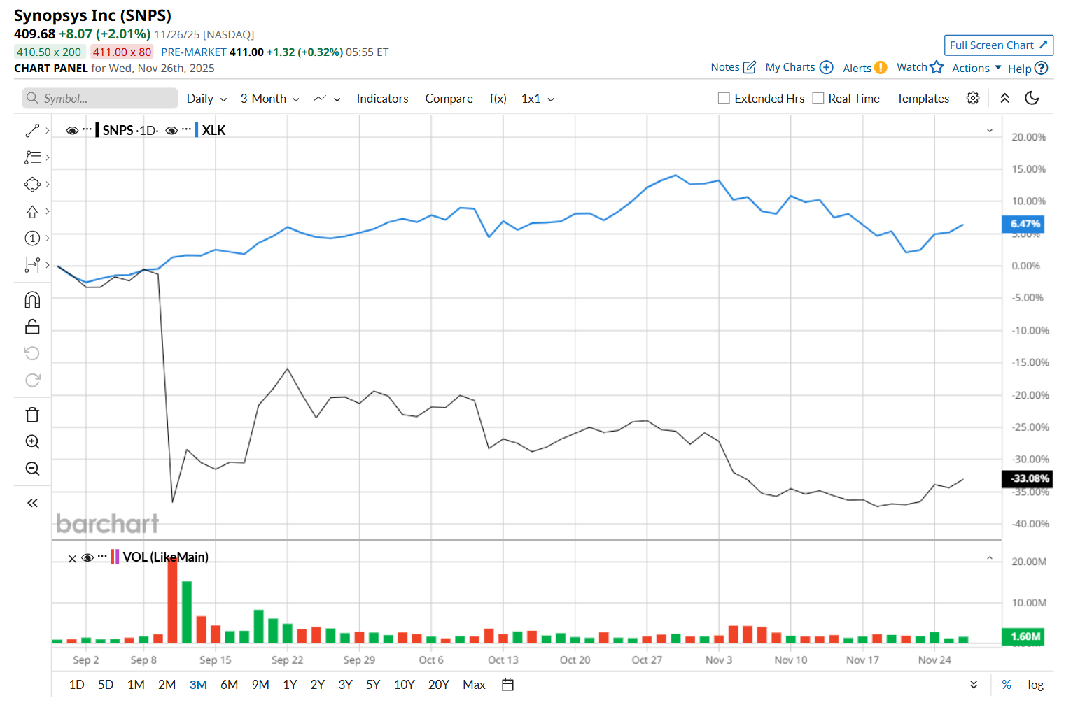 Despite its notable strength, this tech company has slipped 37.1% from its 52-week high of $651.73, reached on Jul. 30. Shares of Synopsys have declined 31.1% over the past three months, considerably underperforming the Technology Select Sector SPDR Fund’s (XLK) 7.9% rise during the same time frame.