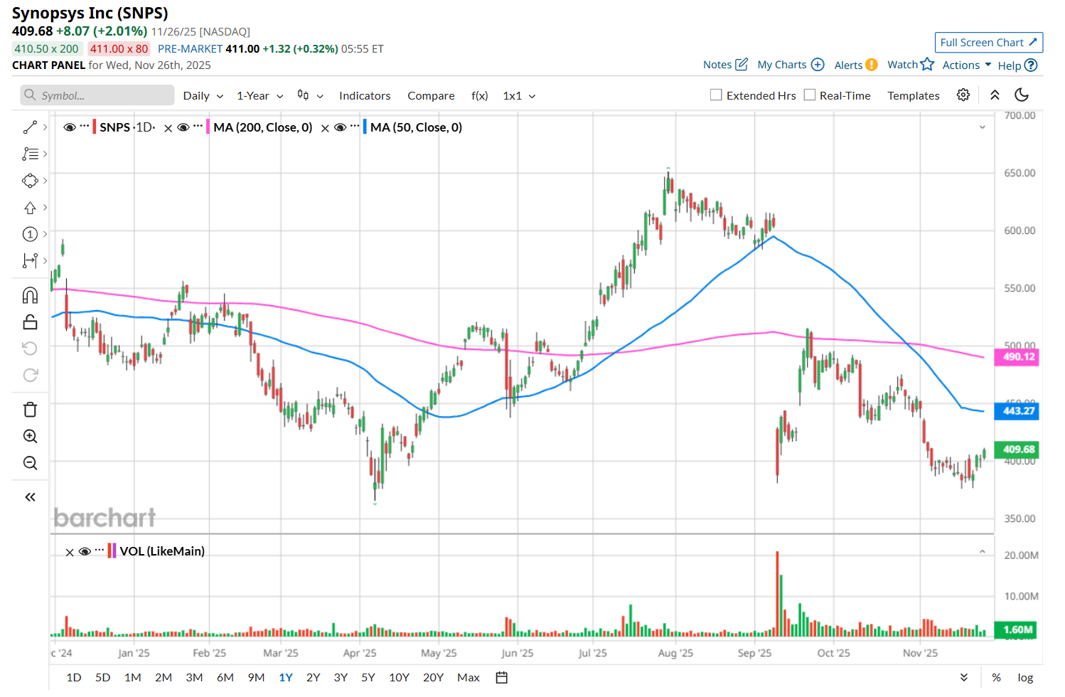 Sunnyvale, California-based Synopsys, Inc. (SNPS) is a leader in electronic design automation (EDA) software, semiconductor intellectual property (IP), and silicon-to-systems solutions. Valued at a market cap of $76.1 billion, the company’s tools enable engineers to create complex integrated circuits and system-on-chips for applications spanning AI, automotive, cloud computing, mobile, and high-performance computing.