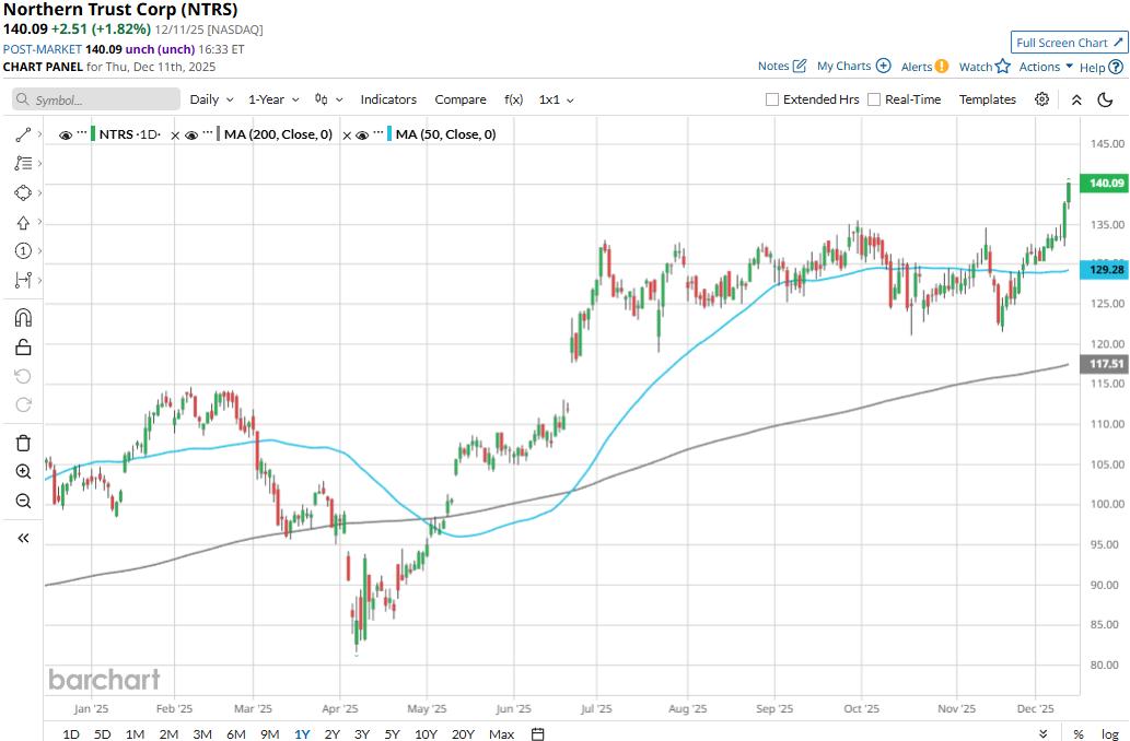 Meanwhile, NTRS stock has traded consistently above its 200-day moving average since early May and above its 50-day moving average since late November, underscoring its bullish trend.