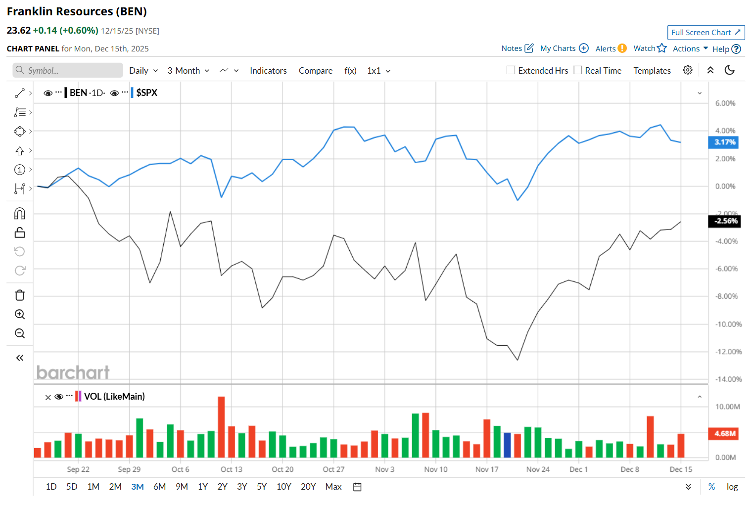 This financial company has slipped 9.4% from its 52-week high of $26.08, reached on Aug. 13. Shares of BEN have declined 3% over the past three months, underperforming the S&P 500 Index’s ($SPX) 3% rise during the same time frame.