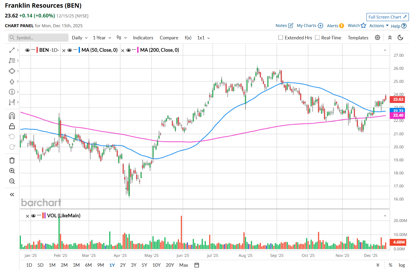 To confirm its bullish trend, BEN has been trading above its 200-day moving average since early May, with slight fluctuations, and has remained above its 50-day moving average since early December.