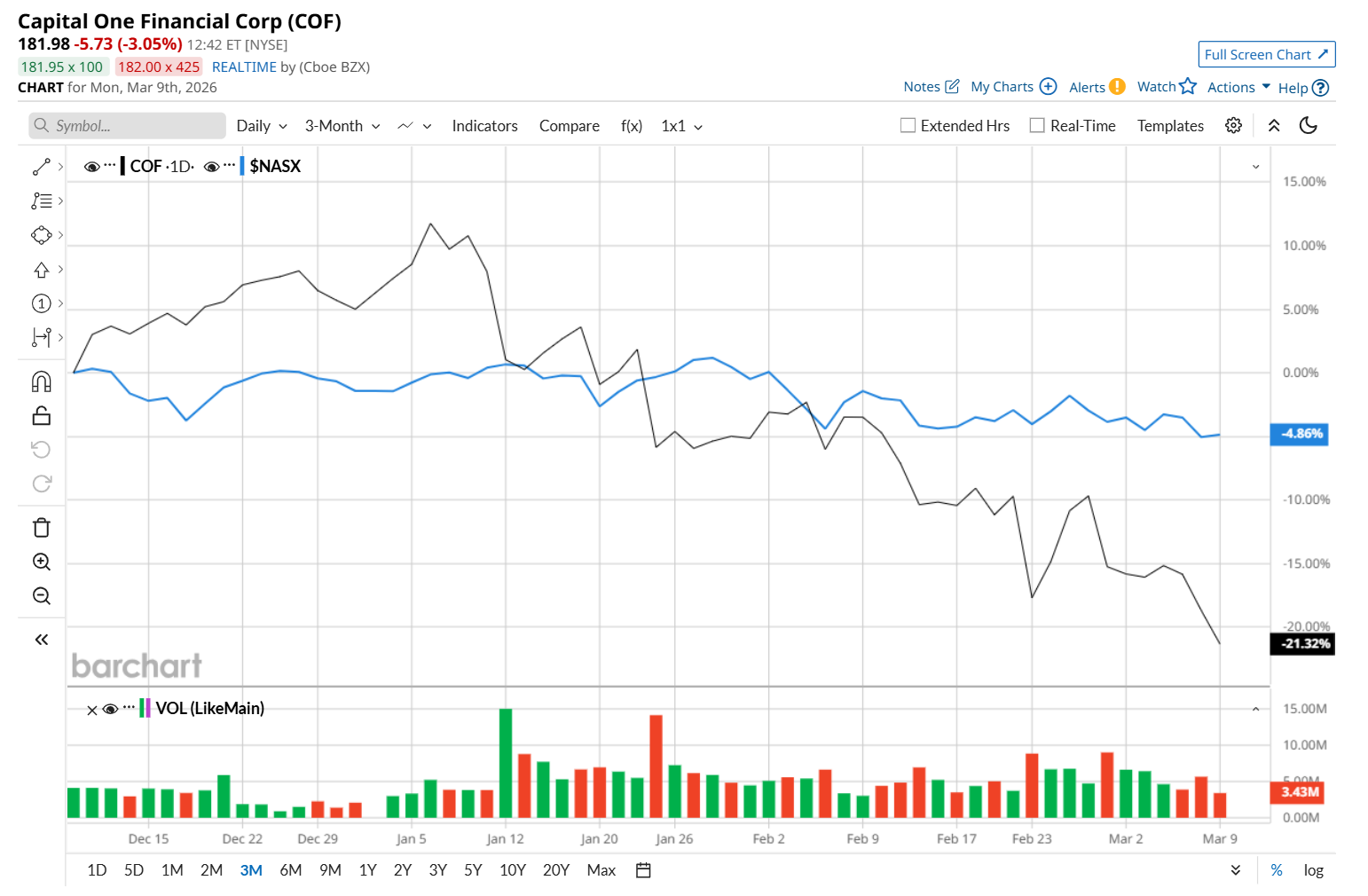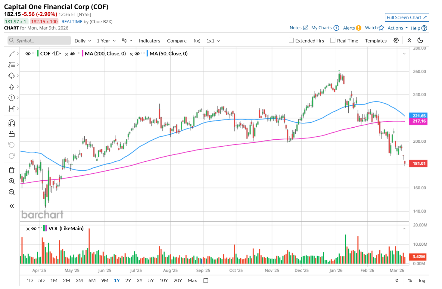 This financial company has slipped 30.1% from its 52-week high of $259.64, reached on Jan. 6. Shares of COF have declined 21.7% over the past three months, underperforming the Nasdaq Composite’s ($NASX) 5.2% drop during the same time frame.