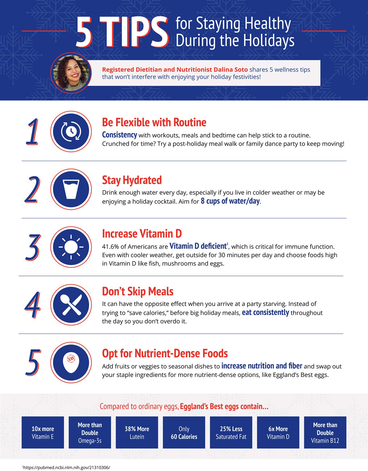 (BPT) - Holiday season is in full swing, and between family parties and work events, it can be challenging to maintain healthy habits. To keep your wellness in check this winter, here's five simple Registered Dietitian-approved tips including how to choose wholesome and nutritious ingredients such as Eggland's Best eggs, which provide superior nutrition, taste and freshness compared to ordinary eggs!