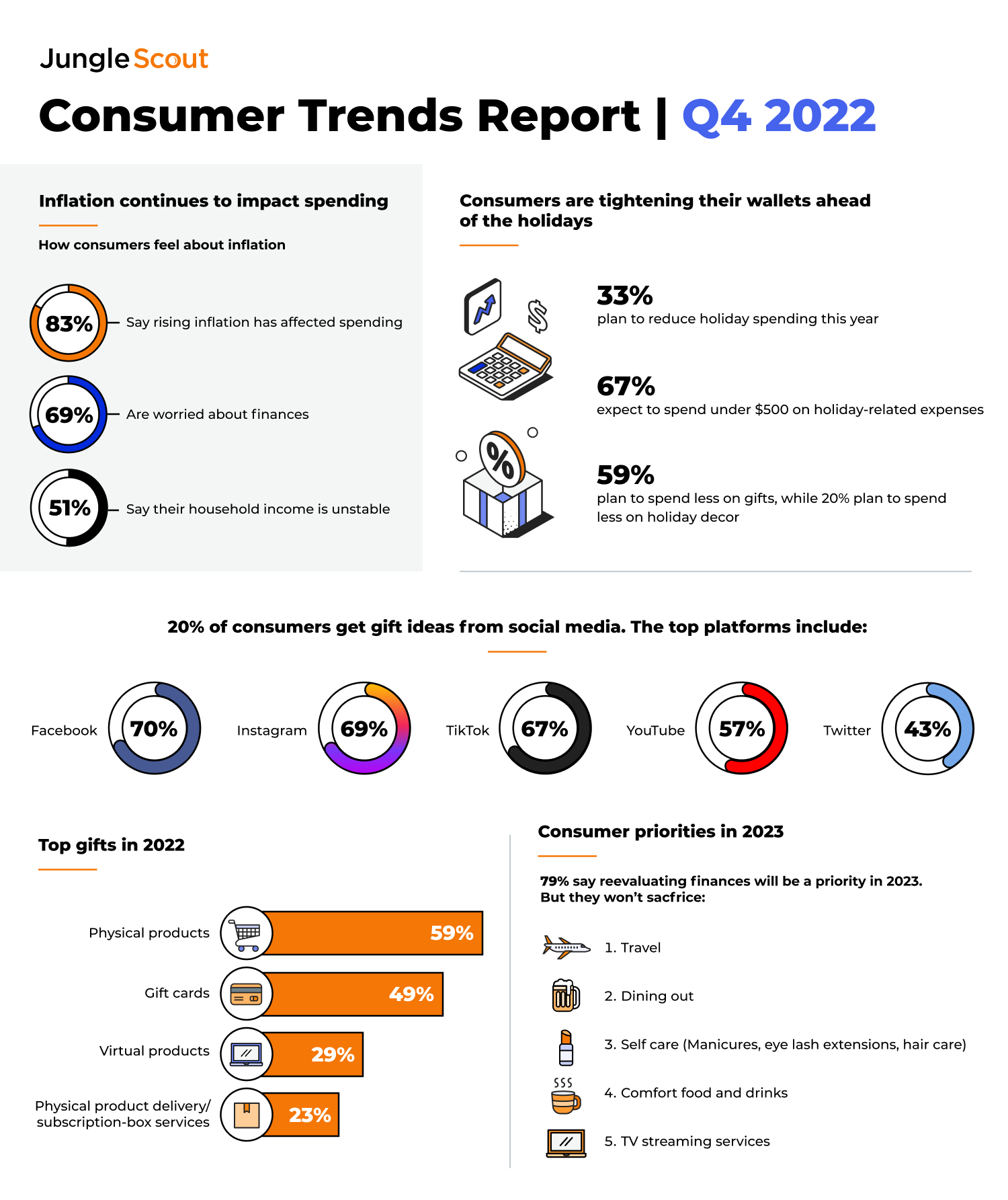 AUSTIN, Texas, Dec. 06, 2022 (GLOBE NEWSWIRE) -- Today, Jungle Scout, the leading all-in-one platform for e-commerce sellers, released its Q4 2022 Consumer Trends Report, a survey of more than 1,000 U.S. consumers on spending and behavior during the 2022 holiday season. The report examines how shoppers navigate the current economic climate and finds that consumers are expected to spend nearly 40% less on holiday-related expenses this year compared to the 10-year national average.1