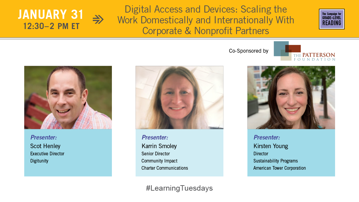 Because of this experience in increasing digital access through devices, Digitunity's executive director Scot Henley has been invited to participate in a Funder-to-Funder Workshop hosted by The Patterson Foundation in partnership with the Campaign for Grade-Level Reading entitled "Digital Access and Devices." The purpose of this workshop is to explore ways in which philanthropy can support expanding device ownership.