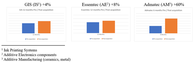 - AM/Admatec revenue grew +60% over 6 months since acquisition.
