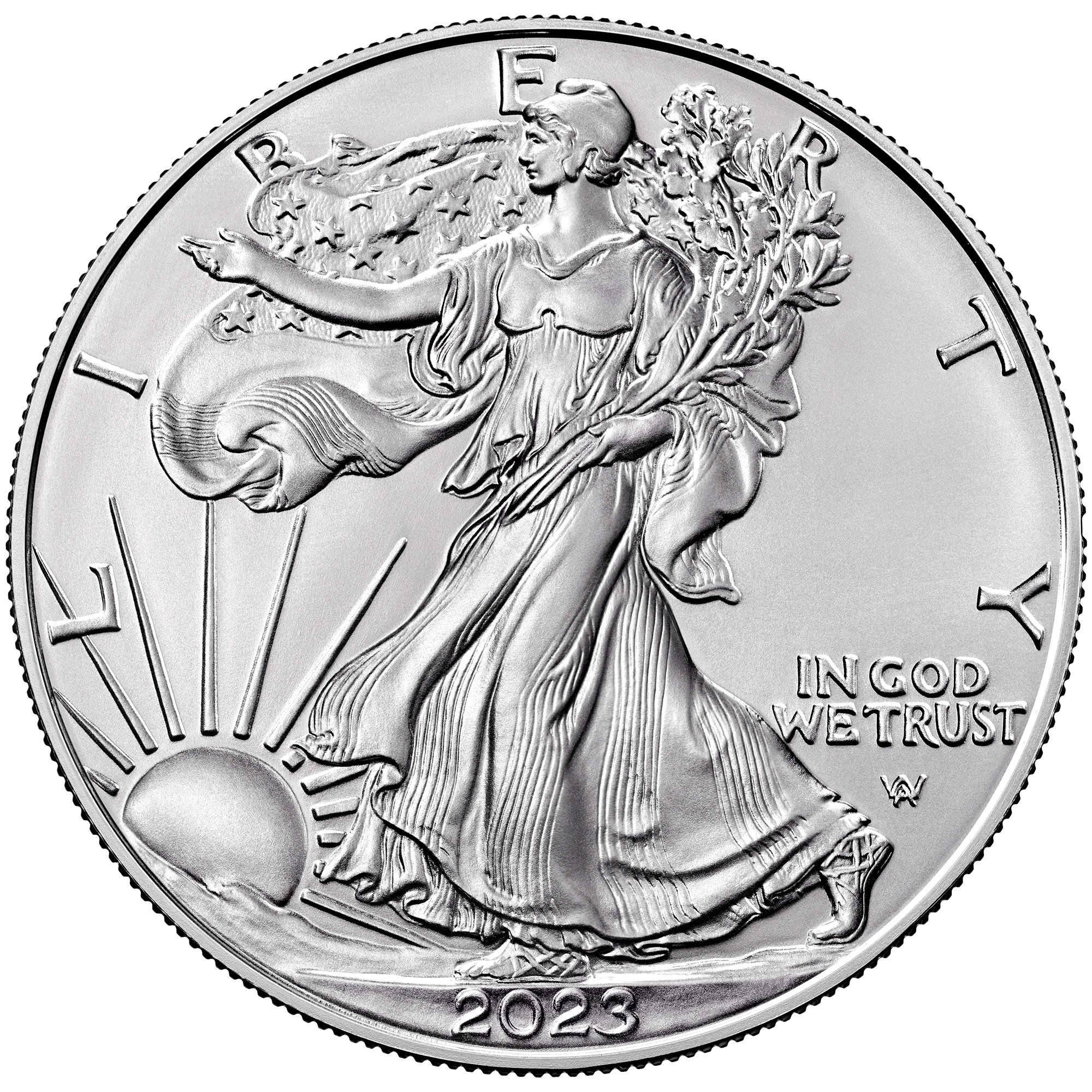 Like its bullion counterpart, the obverse of the American Eagle Silver Uncirculated Coin features sculptor Adolph A. Weinman's full-length figure of Liberty in full stride, enveloped in folds of the flag, with her right hand extended and branches of laurel and oak in her left. Using technological advancements, the coin has been redesigned to encompass some of Weinman’s original details, which renders a closer reflection of his original vision, including the addition of his traditional artist mark. Inscriptions are “LIBERTY,” “IN GOD WE TRUST,” and “2023.”