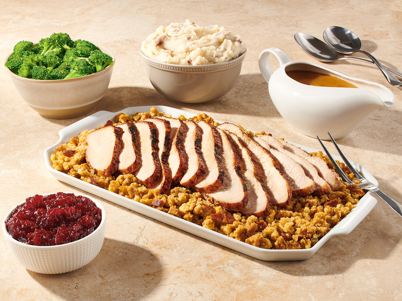 Turkey and Dressing Dinner: This classic Thanksgiving meal features tender carved turkey breast, savory stuffing, turkey gravy, and cranberry sauce. The dish comes with two sides and dinner bread.
