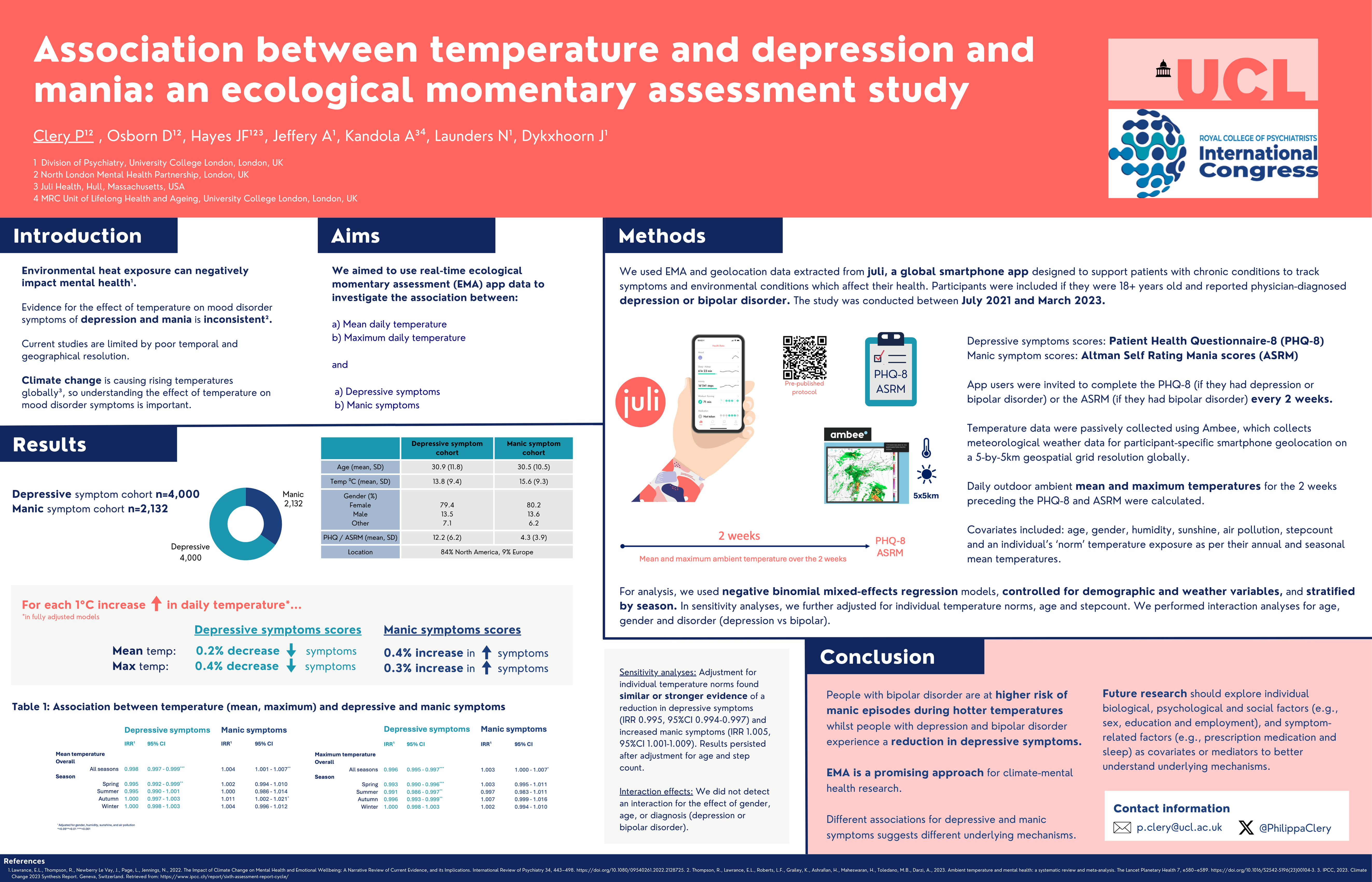 Boston, July 25, 2024 (GLOBE NEWSWIRE) -- Dr. Pip Clery from University College London (UCL) has been awarded the 2024 Royal College of Psychiatrists International Congress poster prize in the Research category for her groundbreaking study on the impact of outdoor ambient temperature on mental health. The award-winning research, titled "The association between outdoor ambient temperature and depression and mania: an ecological momentary assessment study," was presented at the Congress held in June in Edinburgh, UK.