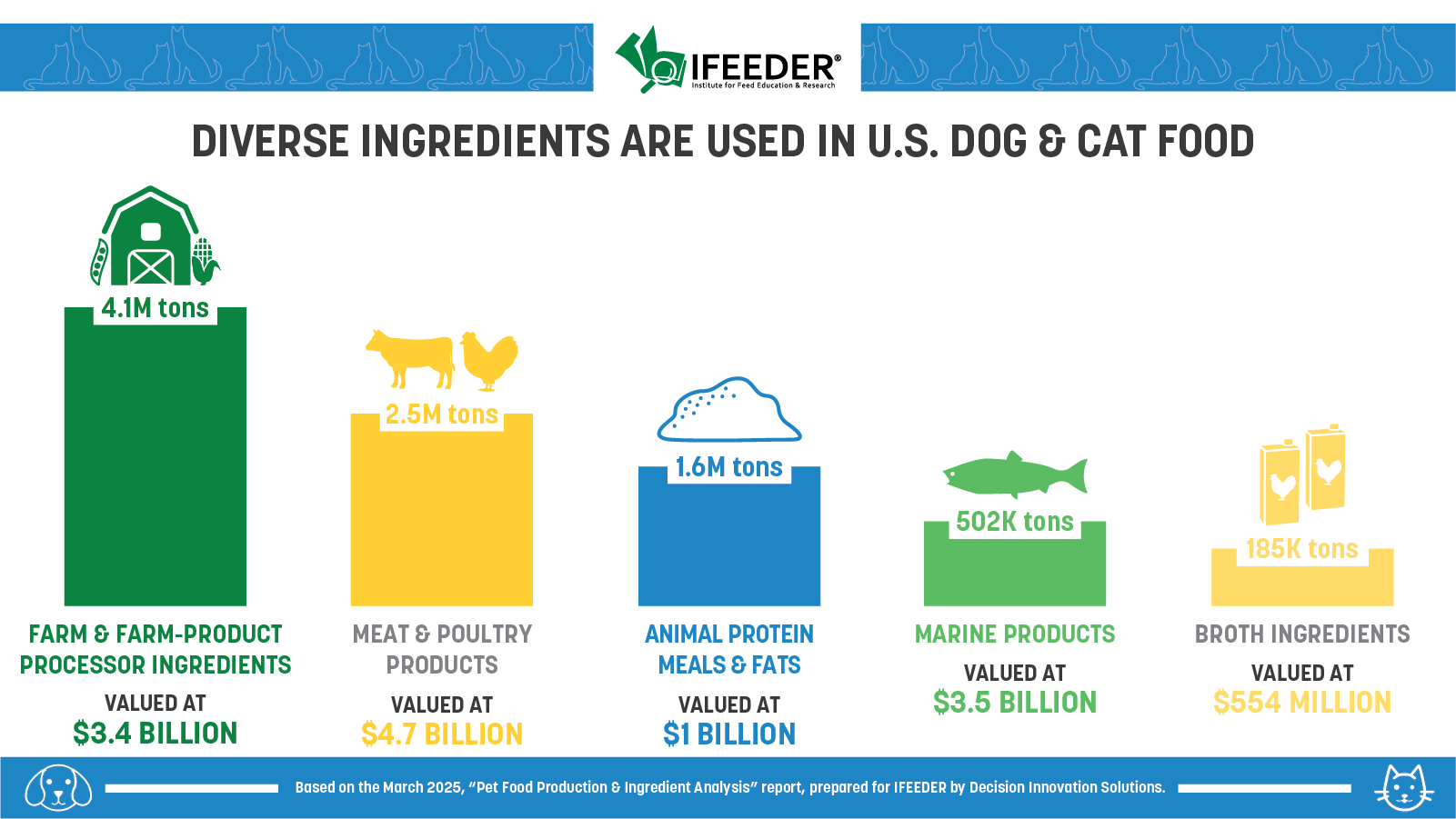 Arlington, Va, April 07, 2025 (GLOBE NEWSWIRE) -- ARLINGTON, Va. – April 7, 2025 – In collaboration with the American Feed Industry Association (AFIA), North American Renderers Association’s (NARA) research arm the Fats and Proteins Research Foundation (FPRF) and Pet Food Institute (PFI), the Institute for Feed Education and Research (IFEEDER) unveiled a new report today that quantifies the hundreds of safe ingredients used in dog and cat food diets. The report estimated that dog and cat food sales stood at $51.7 billion in 2024, with much of the 9.8 million tons represented coming from over 600 nutritious plant- and animal-based ingredients.